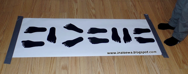 Stopy z papieru smarujemy klejem i przyklejamy na papierze przytwierdzonym do podłogi.